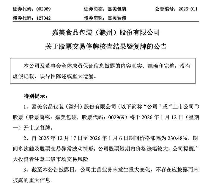 1月11日,嘉美包装(002969.SZ)公告称,停牌期间,公司就股票交易波动情况进行了核查。鉴于相关核查工作已完成,根据相关规定,经申请,公司股票将于年1月12日开市起复牌。自2025年12月17日至2026年1月6日期间价格涨幅为230.48%,期间多次触及股票交易异常波动情形,公司股票短期内价格涨幅较大,公司提醒广大投资者注意二级市场交易风险。逐越鸿智不存在未来12个月内改变上市公司主营业务或对上市公司主营业务进行重大调整的计划;不存在未来12个月内对上市公司或其子公司的资产和业务进行出售、合并、与他人合资或合作、或上市公司拟购买或置换资产的计划;不存在未来36个月内通过上市公司借壳上市的计划或安排。