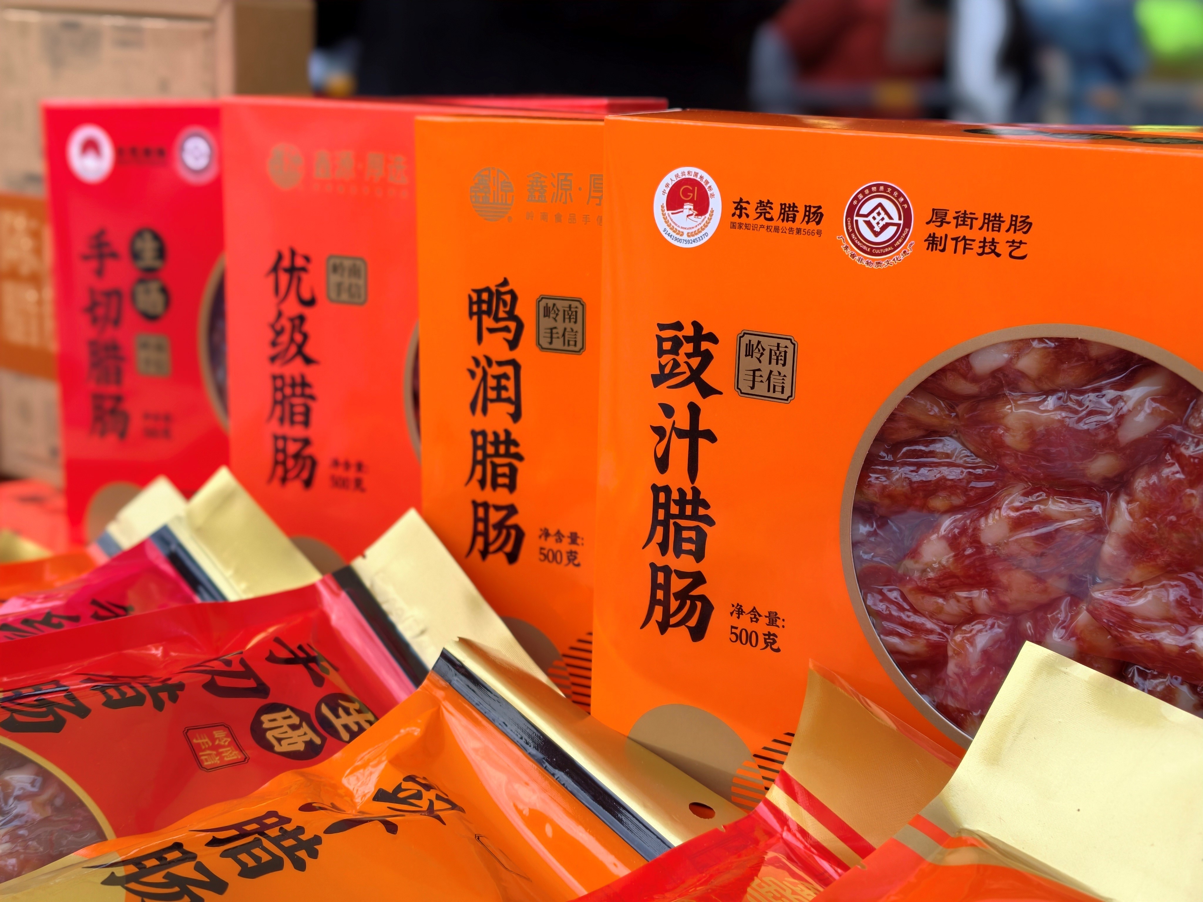 市场的反应最为直观。在厚街镇,以鑫源食品为代表的老字号工厂店迎来了客流高峰。公司负责人、东莞厚街腊肠非遗代表性传承人陈颢承介绍,今年春节订单量较去年增长超30%。除了传统的腊肠礼盒,一款融合了“双非遗”创意的腊肠产品尤为抢手。商家创造性地将厚街腊肠制作技艺与730天晾晒周期的古法酱油相结合,推出了“双非遗”腊肠,还创新研发陈皮腊肠等产品,独特的风味层次让不少外地游客眼前一亮。