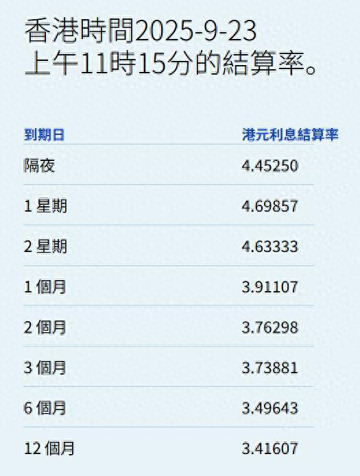 隔夜息报4.4525%,升31.821基点;一周拆息升39.69基点,报4.69857%,两周则升34.952基点,报4.63333%。长息方面,六个月拆息升7.47基点,报3.49643%,一年期则升2.631基点,报3.41607%。